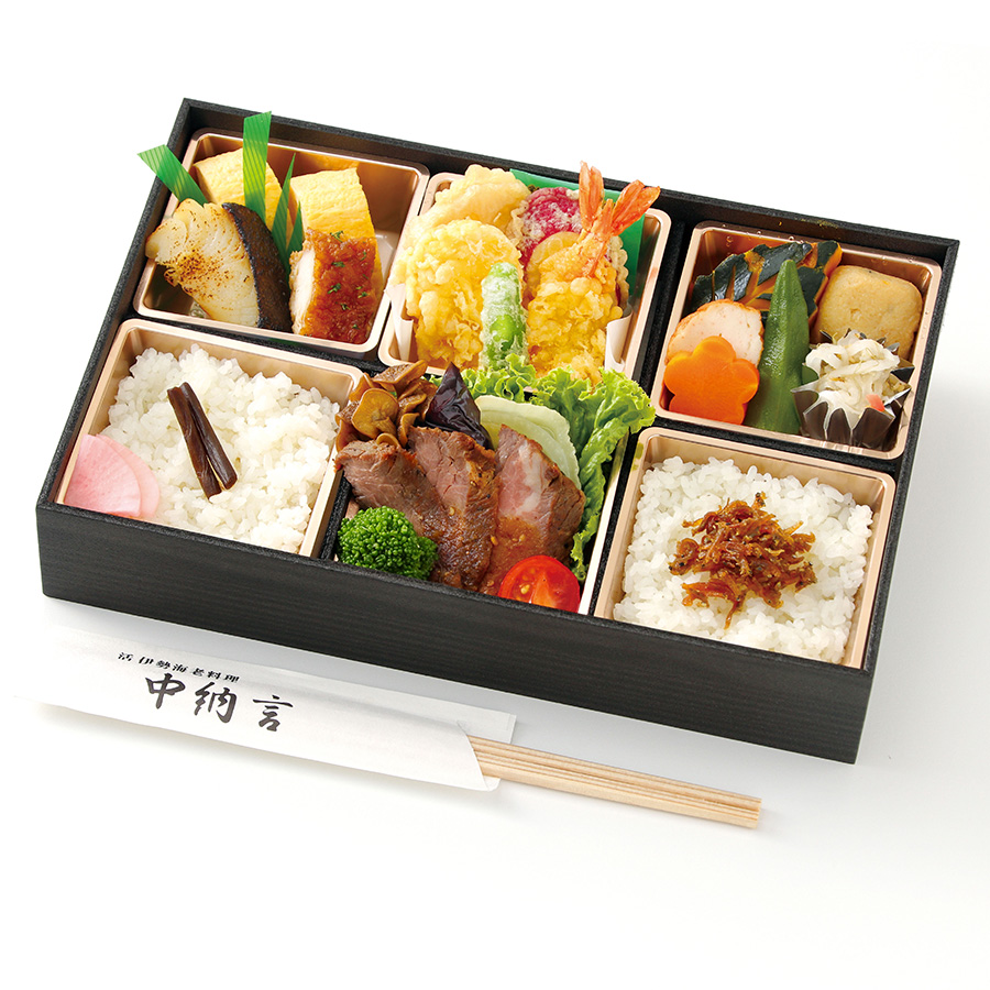 ビーフステーキと海老の天麩羅を一折に。野菜の炊き合せ、中納言特製だし巻など、職人の技が光るお弁当です。