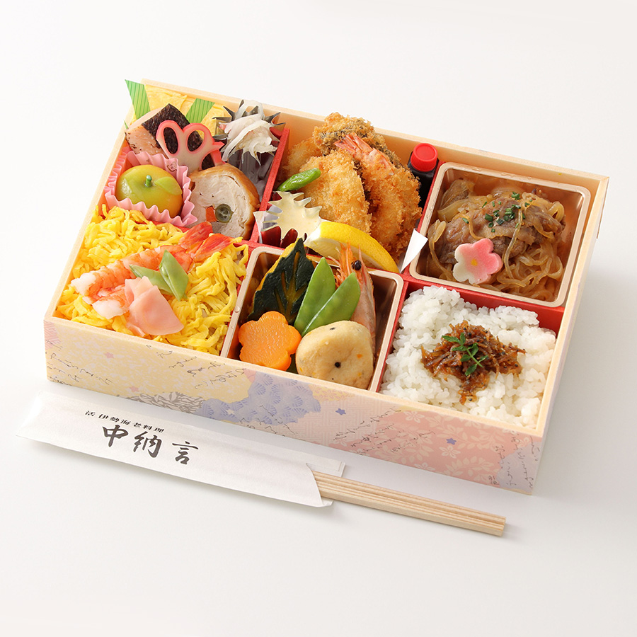 | 弁当内容 | ※季節のお弁当は、春(3月−5月)夏(6月−8月)秋(9月−11月) 冬(12月−2月)で内容が変わります。詳しくはお問合せください。 冬のお弁当: 「国産牛すき焼風」 「海老と河豚のフライ」 「手作り出し巻き」 「焼魚」 「鶏三色巻」 「紅白なます」 「炊き合わせ」 「ちらし寿司」 「ちりめんご飯」 「金柑甘露煮」 (仕入れ状況により内容が変更する場合があります) |